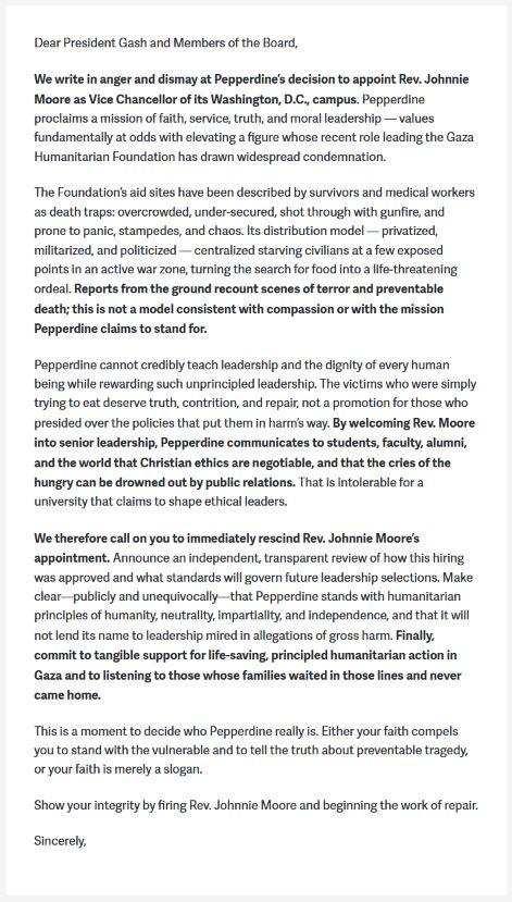 The group organized an Oct. 17 protest in front of Pepperdine’s Washington, D.C., campus in response to the recent hiring of the Rev. Johnnie Moore, Jr., who has served as the executive chairman of the Gaza Humanitarian Foundation (GHF) since early June. The GHF has been the subject of international scrutiny, including from U.N. experts, who called for its immediate dismantling in an Aug. 5 press release, citing mass killings near GHF aid distribution sites enacted by Israeli forces and GHF contractors.