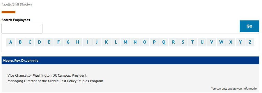 A listing for the Rev. Johnnie Moore, Jr. in Pepperdine’s internal Faculty/Staff directory. Moore is listed under the President’s office in the directory.