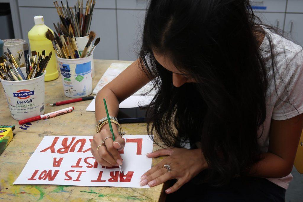 Senior Studio Arts major Inara Ali paints “Art is not just a luxury” on her poster Oct. 9. Bidewell said all art made at the event will be displayed on the Freedom Wall as a message to Pepperdine Administration.
