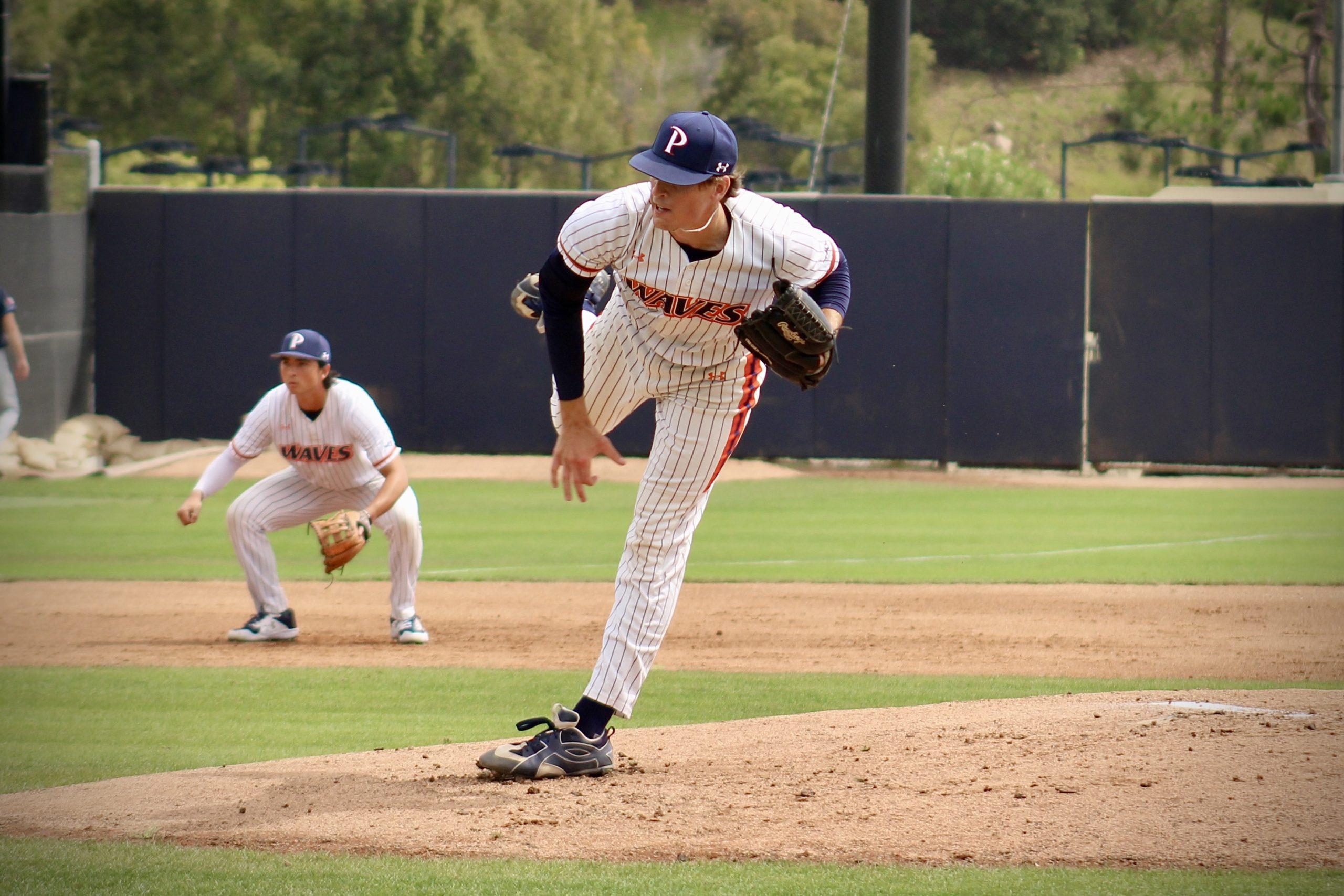 Graduate infielder Daniel Patterson fields the hot corner behind graduate right-handed pitcher Tommy Scavone as he pitches against the University of San Diego on March 28 at Eddy D. Field Stadium. Patterson has started in every game that Scavone has pitched, according to Pepperdine Athletics.