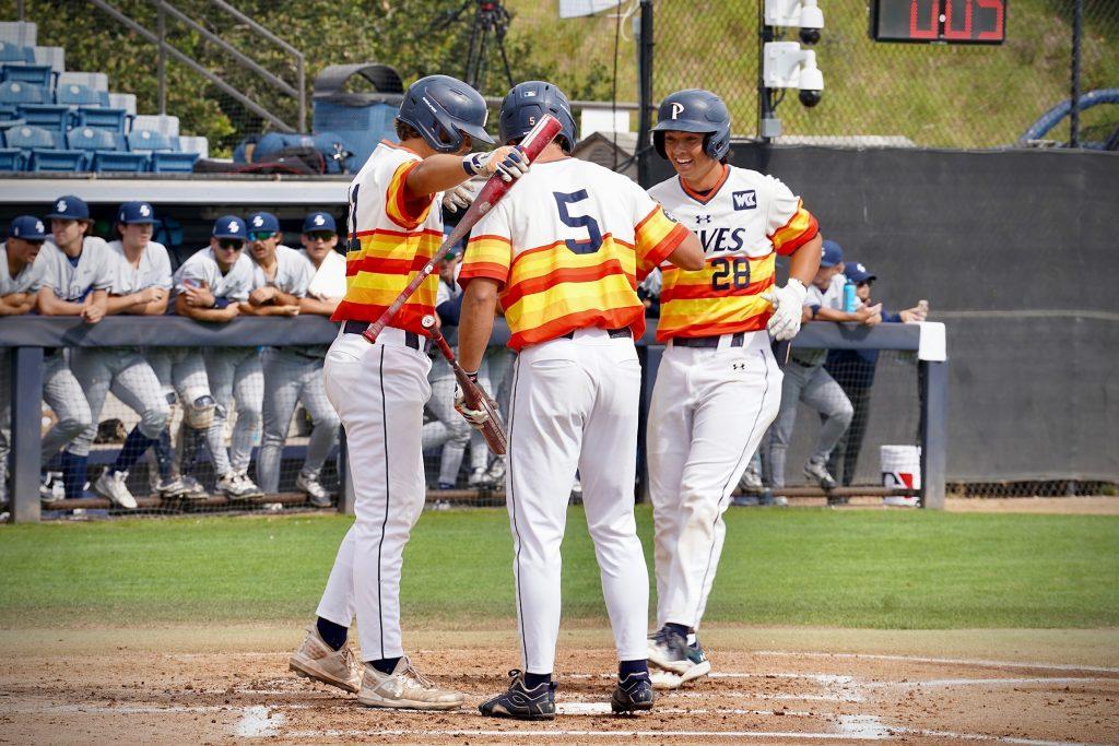 Patterson (right) smiles his way to home plate where freshman first baseman James Dell’Amico (left) and graduate outfielder Trey Dunn (middle) wait to celebrate his seventh home run of the season March 27 at Eddy D. Field Field Stadium. Patterson and Dunn were teammates at Westmont College and transferred to Pepperdine ahead of the 2026 season, according to Pepperdine Athletics.