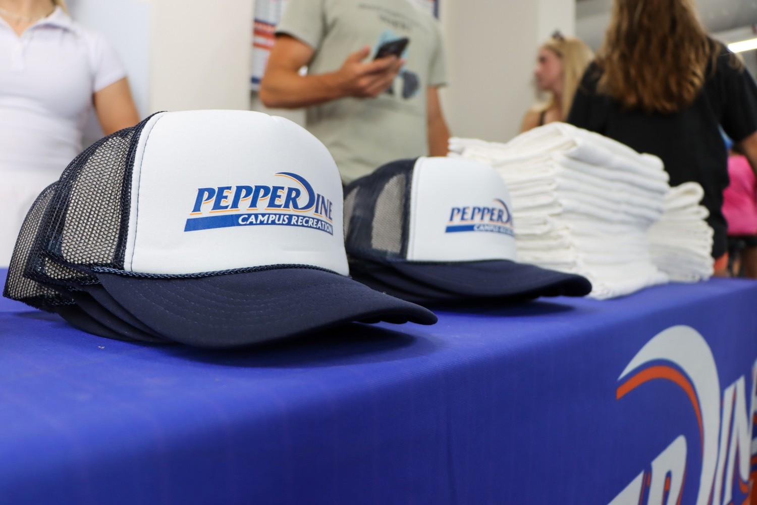 Pepperdine Campus Recreation baseball hats wait patiently for incoming students during the Pepperdine Fitness Center's fall semester grand opening Aug. 31. Bolton said Campus Recreation is proud of the new facility's improvements, compared to the Firestone Fieldhouse Weight Room. Photo credit: Sammie Wuensche