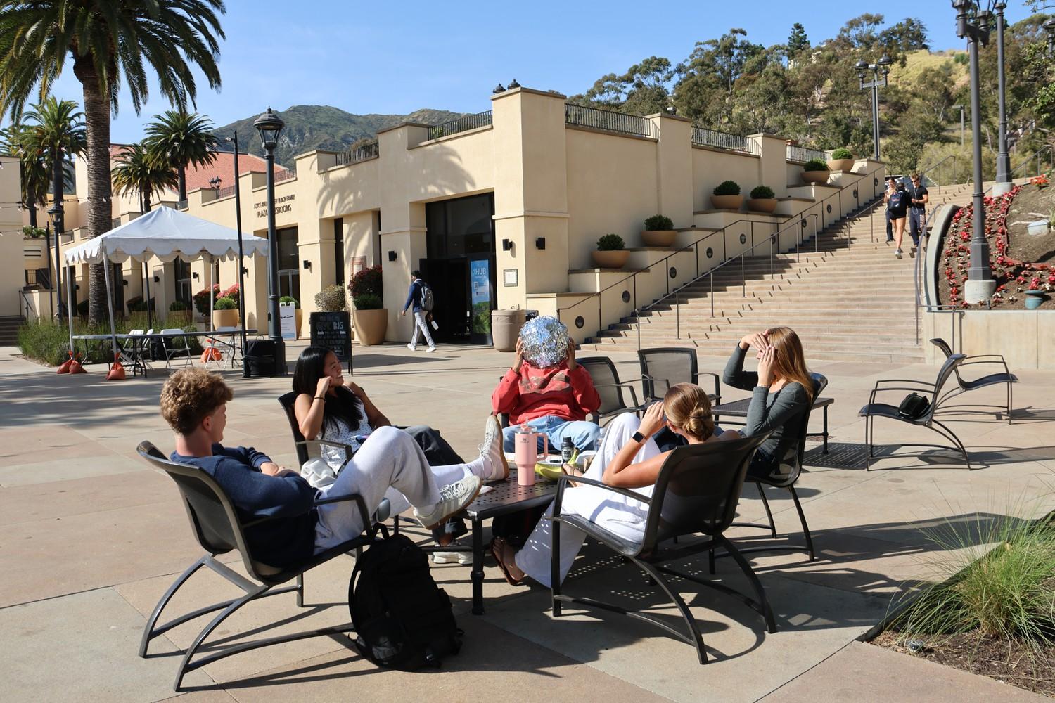 A group of students engage in conversation while one holds a disco ball on Upper Mullin on April 16. The disco ball reflects how every person has different facets of personality. Photo by Soliel Lara Aponte