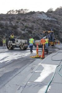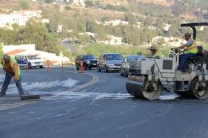 Tractors and cement rollers take up the right side of the street leading up the hill, but DPS has two officers on walkie-talkies guiding all traffic through the left lane going down the hill.