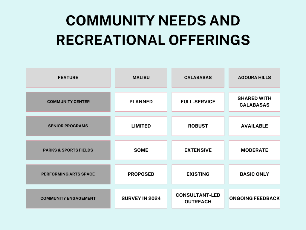 In contrast to Malibu, neighboring communities such as Calabasas and Agoura Hills have large, community-oriented recreational spaces for their residents.