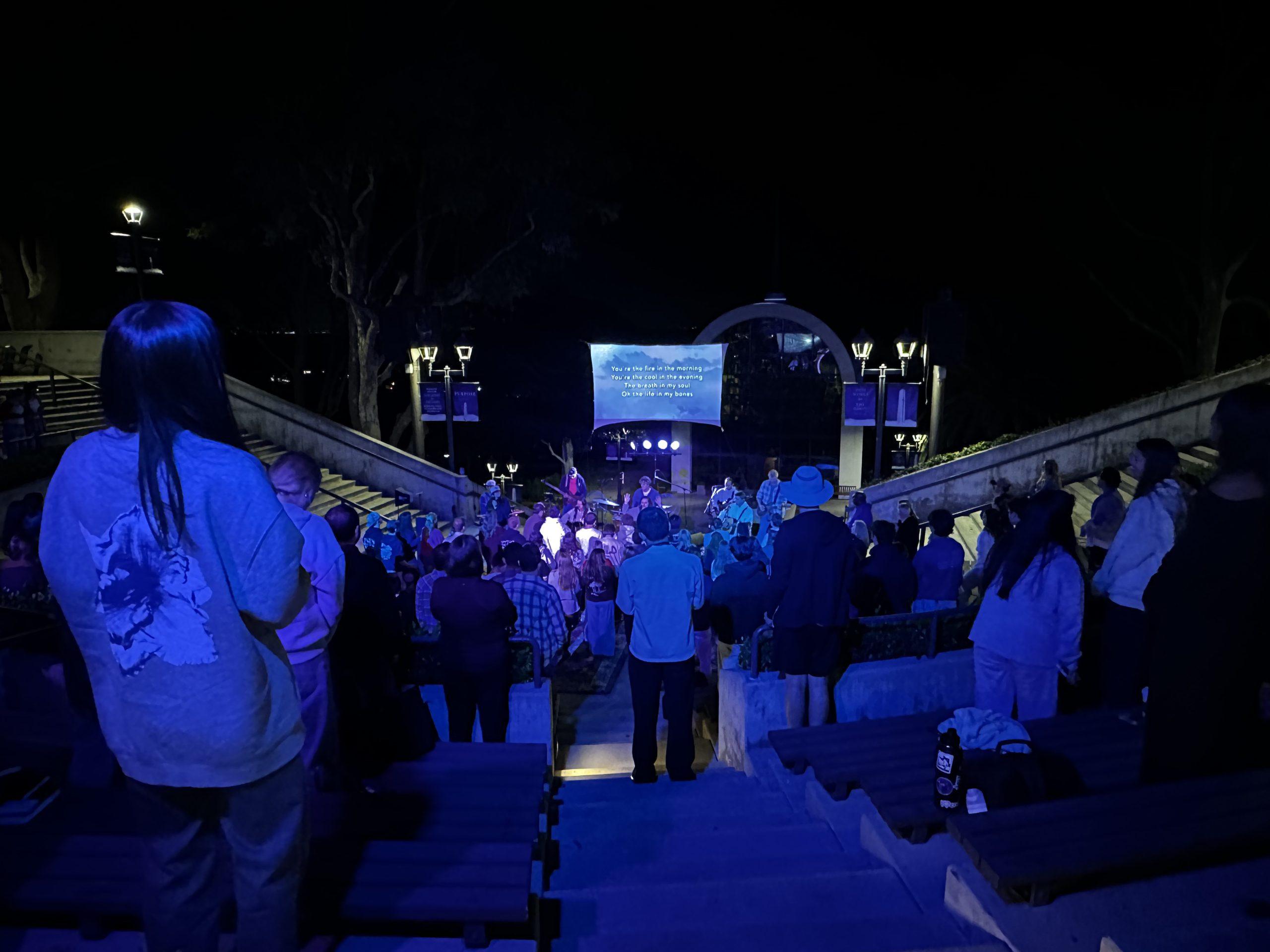 Pepperdine students gather at the Well on Oct. 15 at the Amphitheatre. The Well is one of the weekly University-hosted spiritual gatherings that bring the community together to worship. Photo by Christine Park