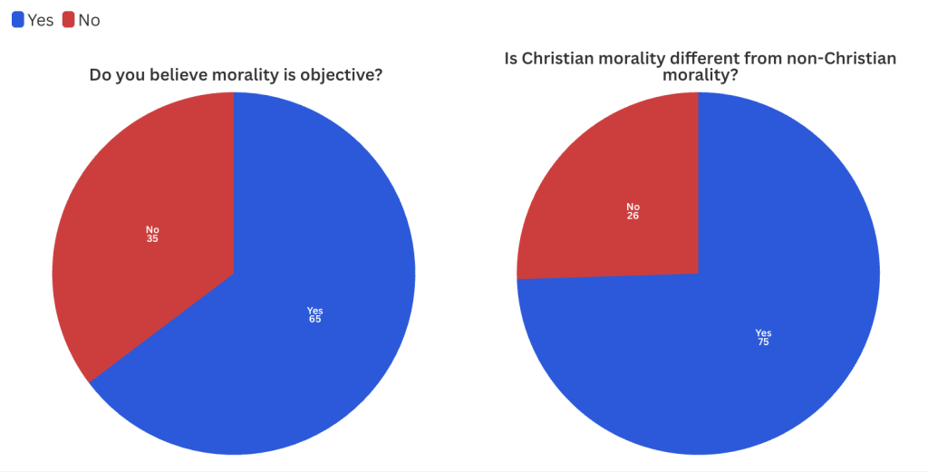 A poll conducted on a sample of 51 Pepperdine students found 64.7% believe morality is objective. In addition, 74.5% of the 51 students responded they believe Christian morality is different from non-Christian morality. Infographics by Christine Park