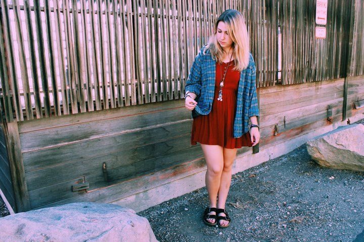 To make a blue flannel look more put together, pair it with a bohemian style dress! This plain orange-red one with slight button detailing adds a touch of femininity to the look, but still allows the flannel to be the main staple of the outfit. Accessories are everything for this outfit. My first model, Lauren Young, wore her rustic, earthy jewelry to complement the outfit. She completes the ensemble with Birkenstocks.