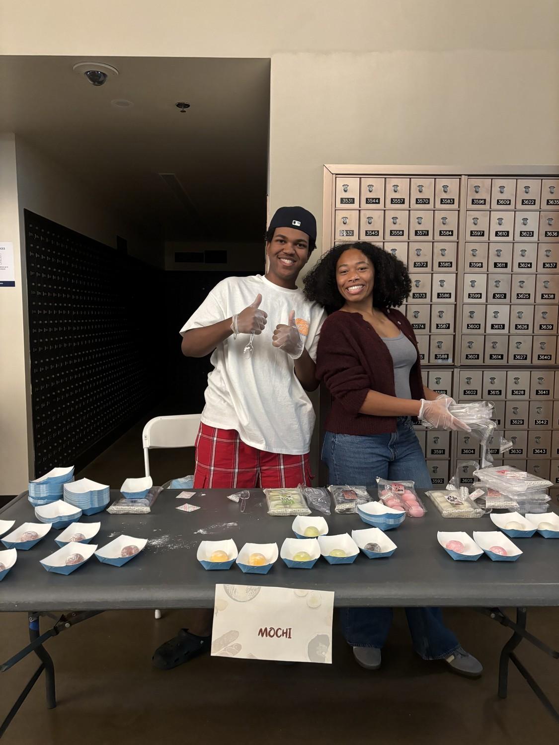 Junior Mason and junior Taniah Orr serve mochi to students during Global Fusion Night at the Lighthouse on Jan. 30. Other cultural foods, such as kalua pork, tanghulu, tacos and more were present at the event. Photo courtesy of Delaney Dickey