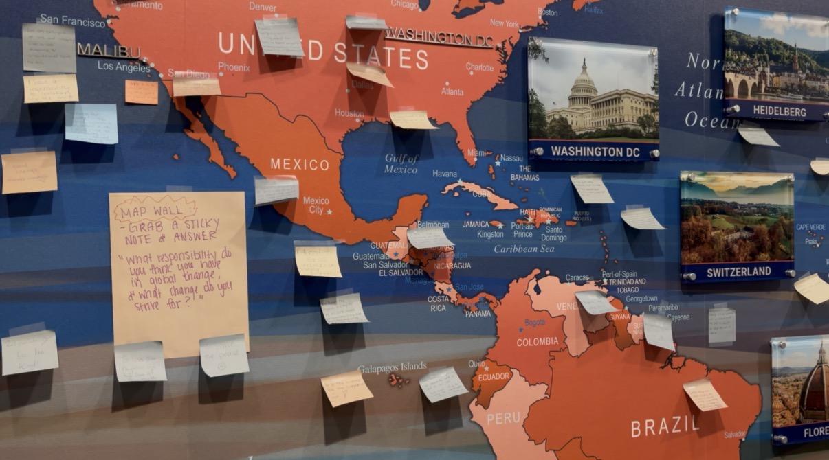 Sticky notes surround the Map Wall, answering the question, “What responsibility do you think you have in global change, and what change would you strive for?” at the International Programs office on Jan. 29. The Map Wall was one of the activities that promoted global citizenry for Pepperdine students. Photo by Christine Park