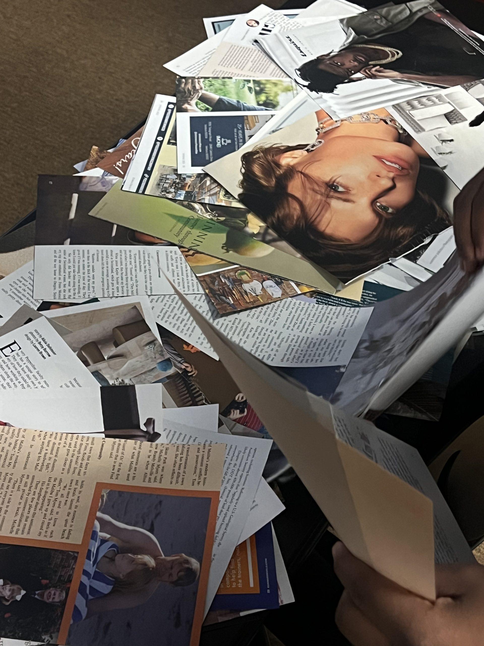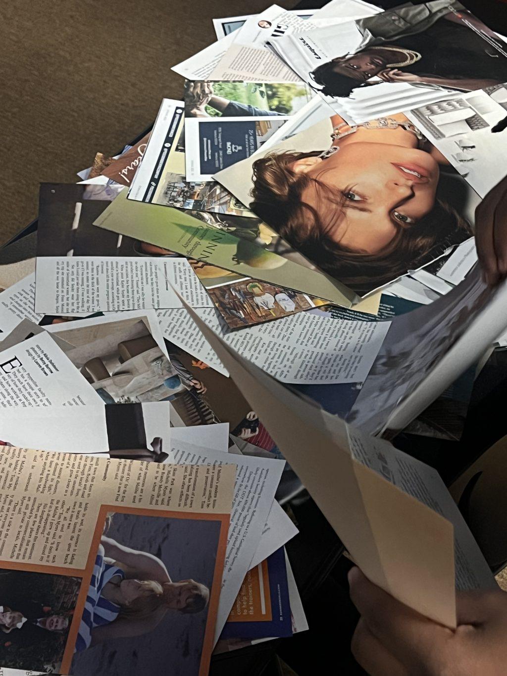 Magazine cutouts lay in a spread in Black Plaza Classroom 190 on Jan. 27. One of the activities at “The World Wears What” was vision board making, where students created boards of favorite styles and aesthetics. Photo courtesy of Taniah Orr