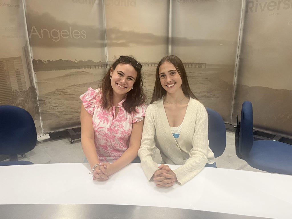 Senior Alicia Dofelmier and alumna Betsy Burrow sit on the NewsWaves 32 set Aug. 14 .They pretended to be anchors for the show. Photo by Elizabeth Smith