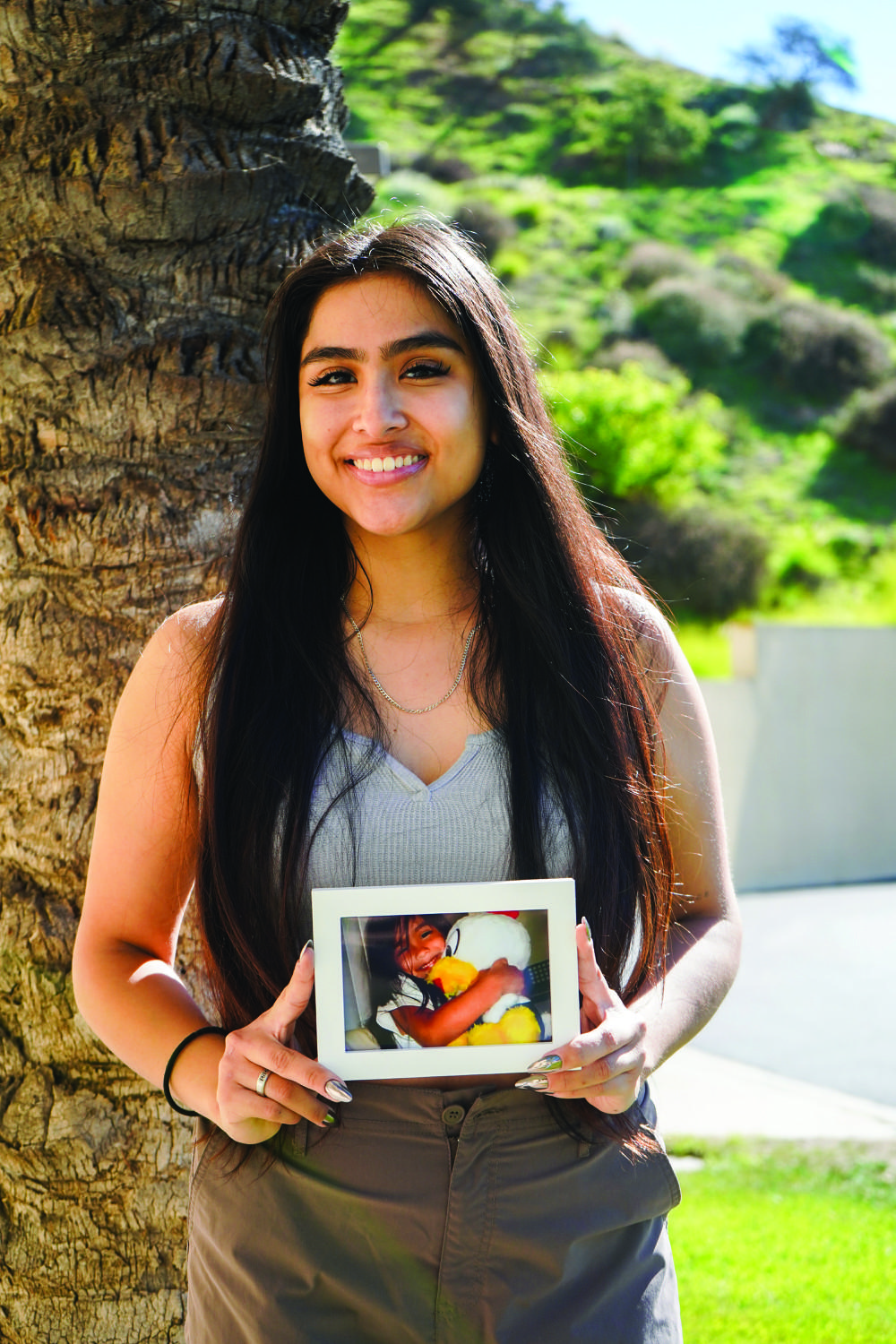 Senior Emi Escobar poses with a baby photo of herself. Photo by Betsy Burrow