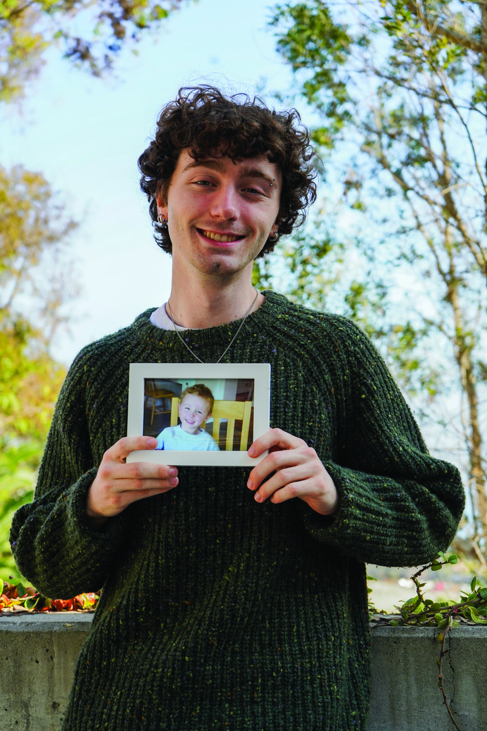 Senior Evan Inrig poses with a baby photo of himself. Photo by Betsy Burrow