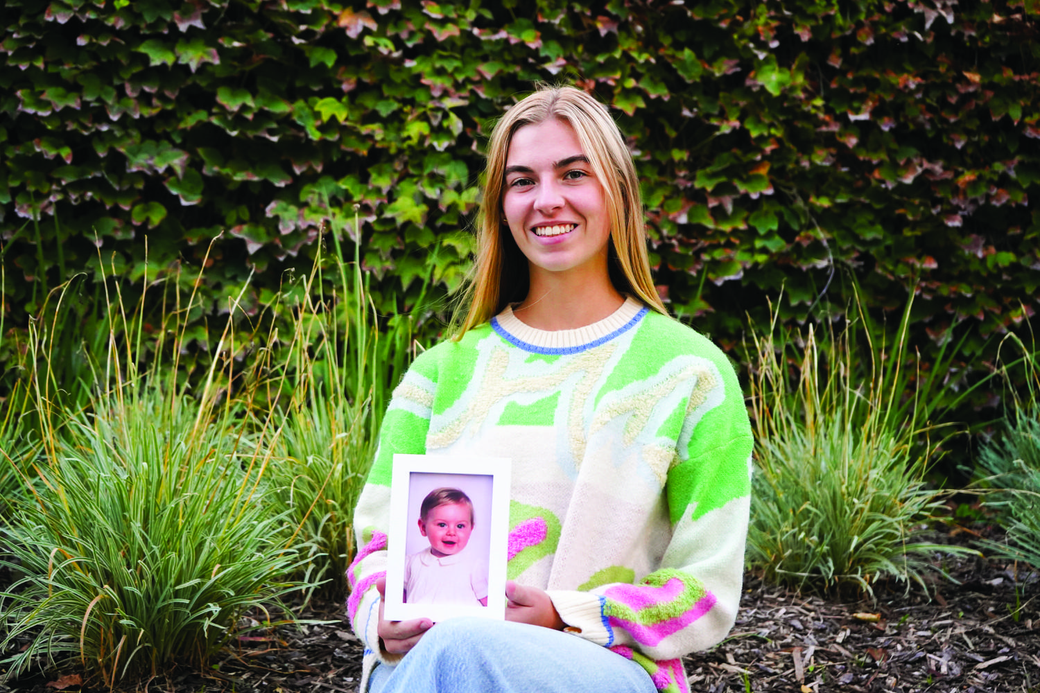 Junior Molly Sams poses with a baby photo of herself. Photo by Betsy Burrow