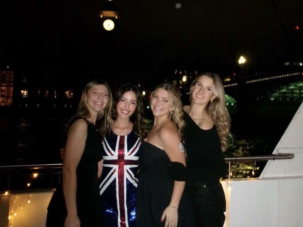 Juniors Josie Politzer (left), Madi Castellanos (second to left), Kinley Billingsley (second to right) and Miriam Vacek (right) on a boat cruise down the Thames River in London on Dec. 11. The group said they celebrated the end of the fall semester with a boat party. Photo courtesy of Madi Castellanos