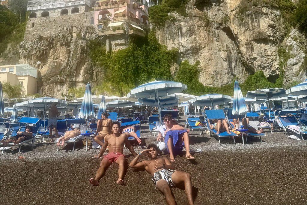 Sophomore Jon Park (left), sophomore Adam Benyaich (middle) and sophomore Zach Greidanus (right) relax on the beach in Positano, Italy on Sept. 13. The group said they took a break from their studies to unwind by the water. Photo courtesy of Adam Benyaich
