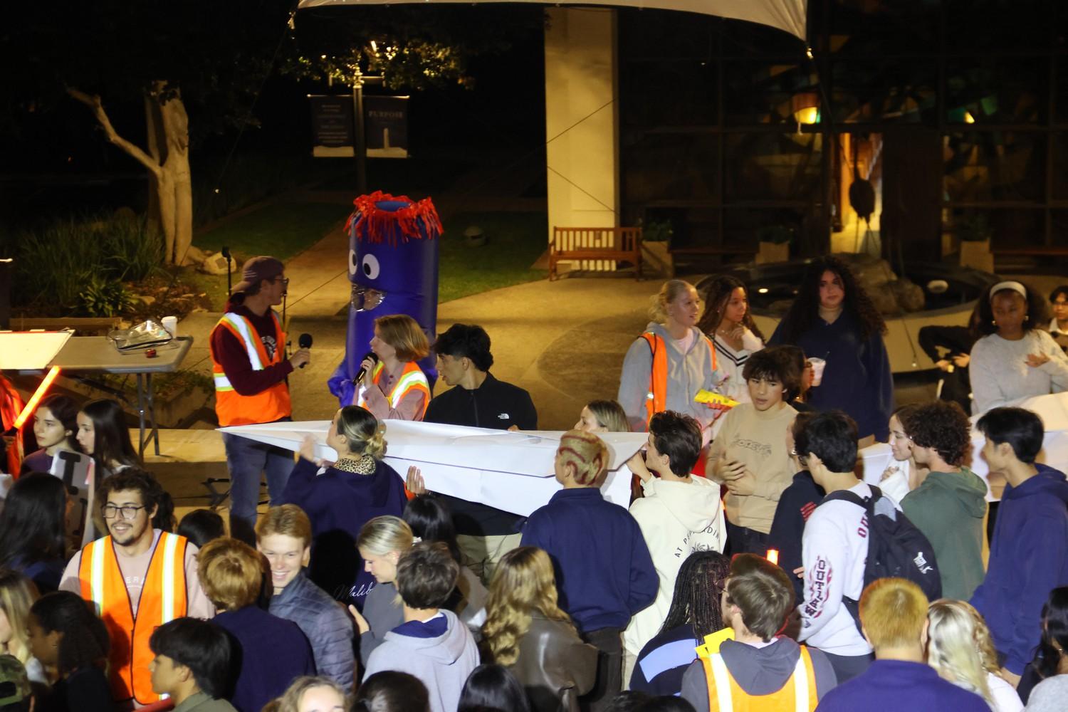 Students work together to build a paper airplane that is at least six feet long. Each activity of the night was a chance for students to come together and build meaningful connections with the people in their programs. Photo by Alayna Yared