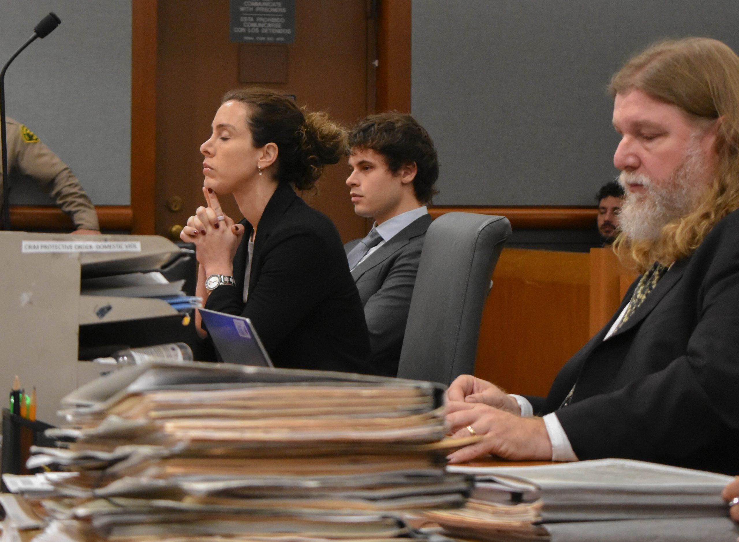 Fraser Michael Bohm (farthest back), Attorney Jacqueline Sparagna and Deputy District Attorney Nathan Bartos (right) sit in the Van Nuys Courthouse at the April 9 pre-trial hearing. Superior Court Judge Thomas Rubinson did not set a trial date at the hearing. Photo by Amanda Monahan