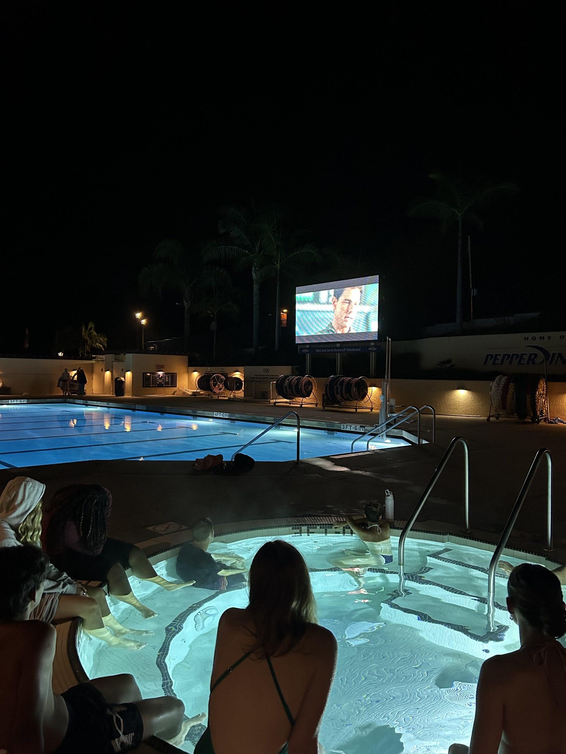 Students spend time relaxing in the jacuzzi at Raleigh Runnels Memorial Pool while watching “Top Gun” on Oct. 25. Lovett said she can tell these events are making a difference in whether students decide to spend their weekends on or off campus.