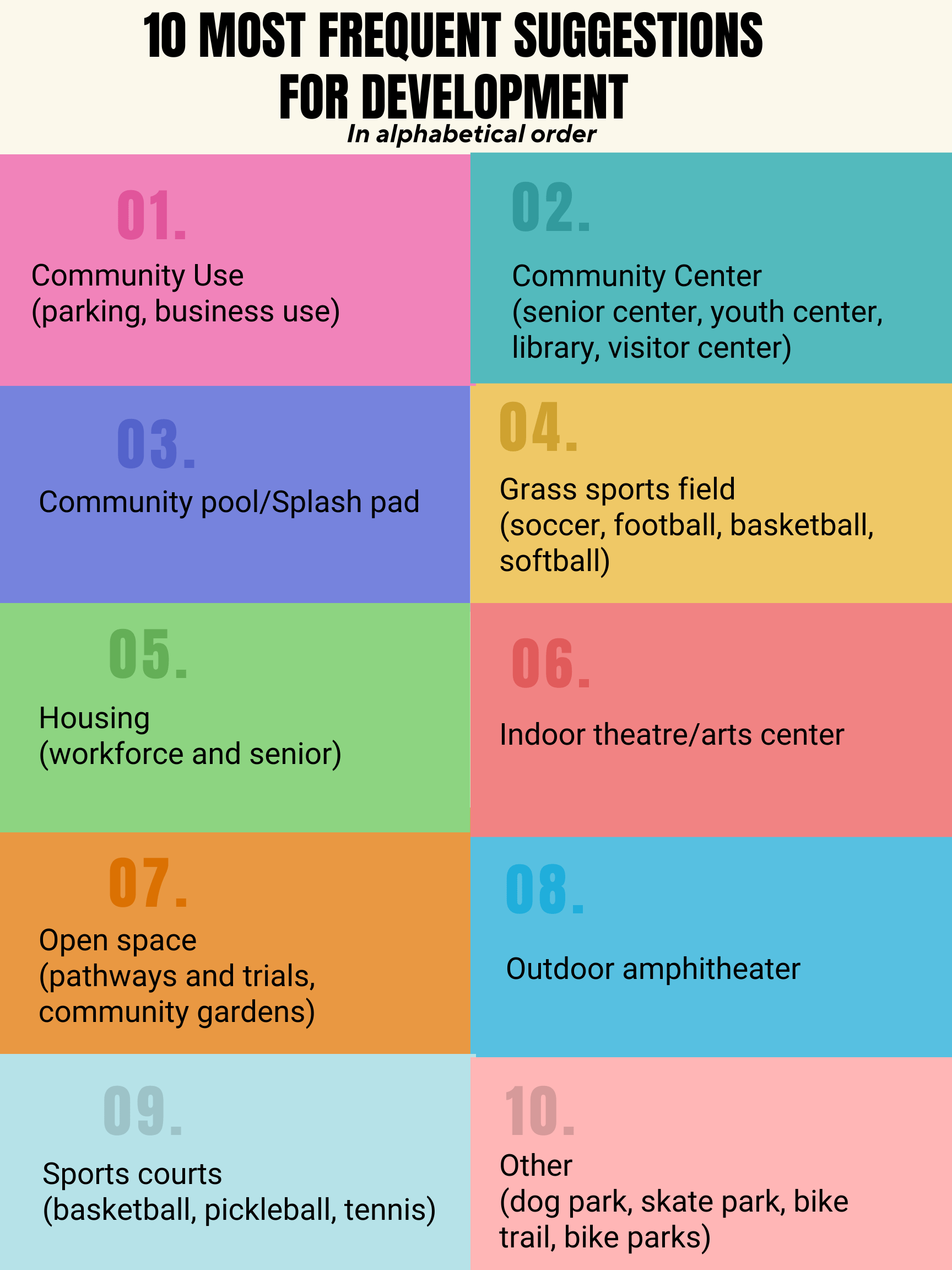 Through the various distribution channels, the Malibu City Council received 723 suggestions. The city identified the 10 most frequent ideas to develop the following categories: