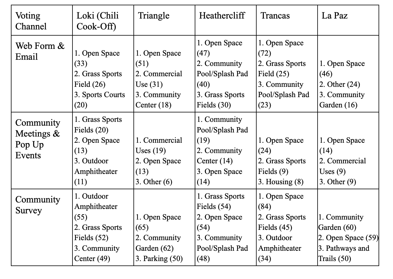 Phase two involved taking the resident’s frequent suggestions from the various distribution channels and narrowing down preferences for development on the lands. The following graph shows the top three developmental ideas received for each parcel of land, as well as the number of votes each suggestion received.