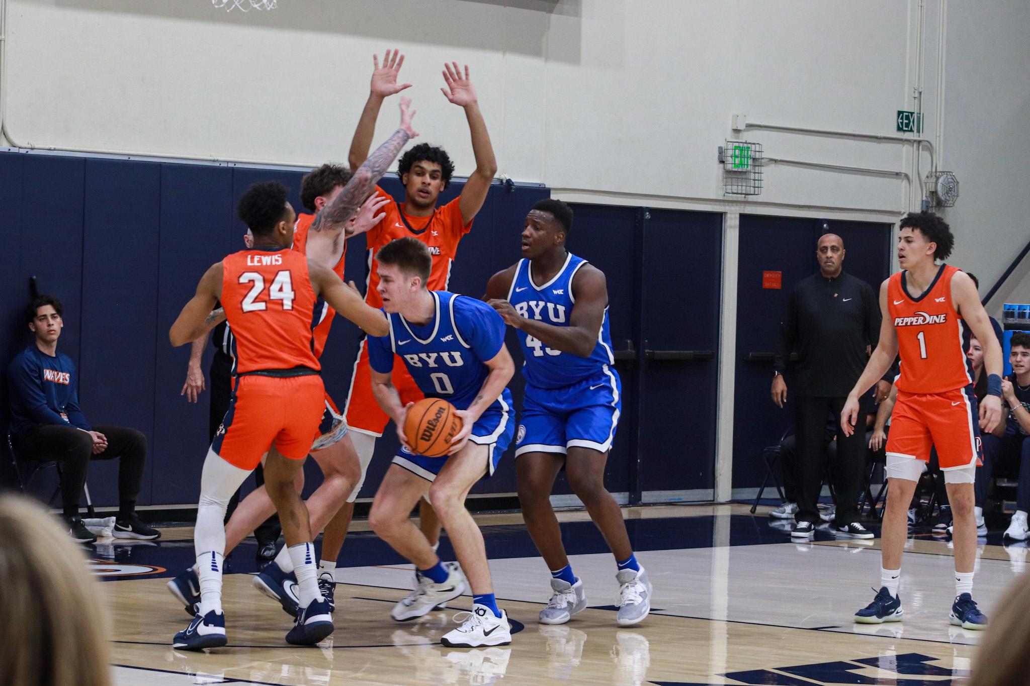 Pepperdine Men's Basketball sophomore forward Maxwell Lewis and Porter surround BYU freshman guard Tanner Toolson on Feb. 9, at Firestone Fieldhouse. The Waves held the Cougars to 21% shooting from 3-point range.