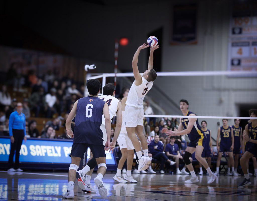 Junior setter Andrej Polomac sets up a Waves attack against the University of California, Irvine on Jan. 16 at Firestone Fieldhouse. Polomac ended the match with a team-high 43 assists.