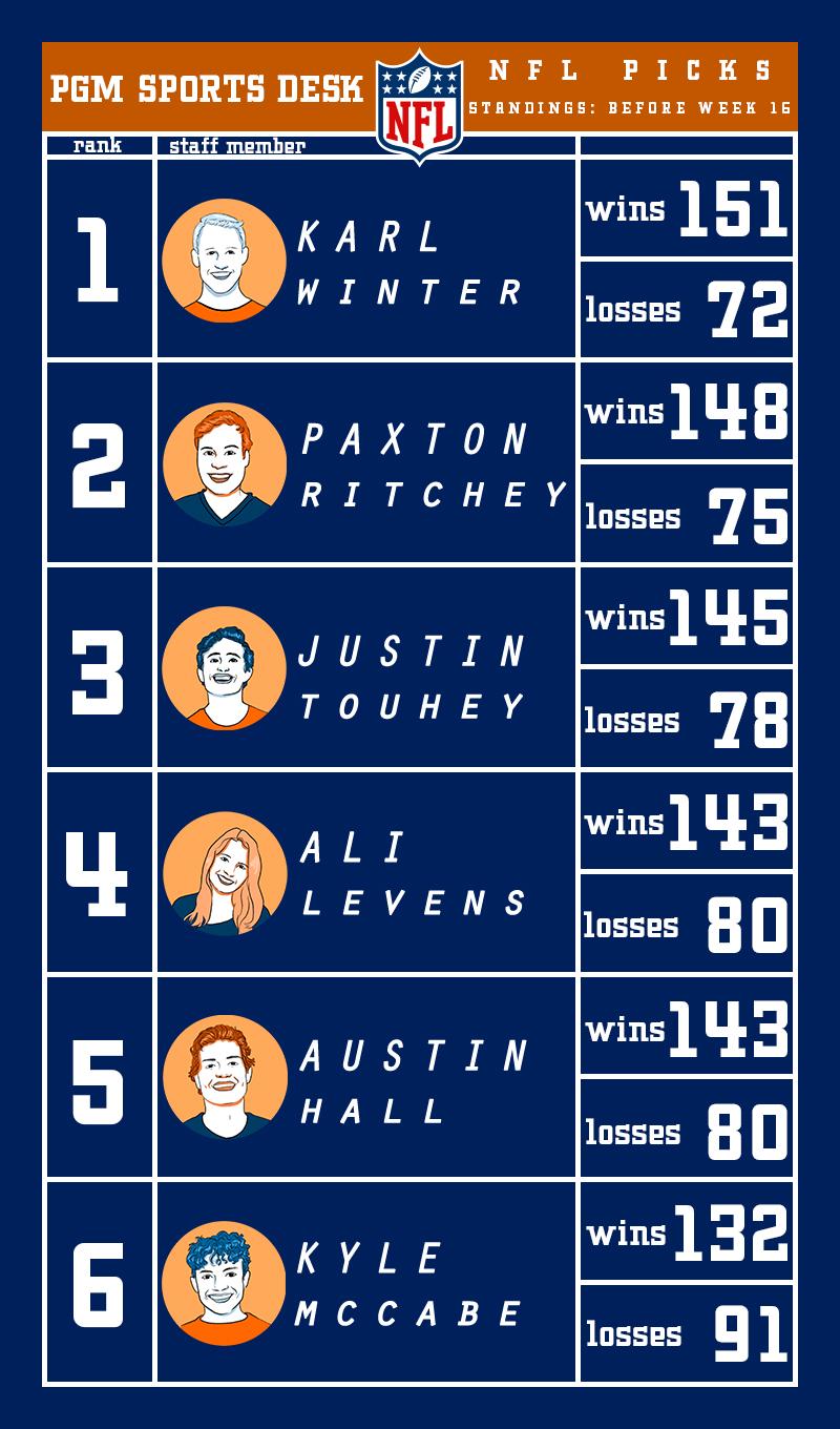 The PGM staff nears the end of the regular season in unity, as we agreed on the winner of 11 of the 16 games this week. If the past 15 weeks have taught us anything, however, it’s that we can take no game for granted.