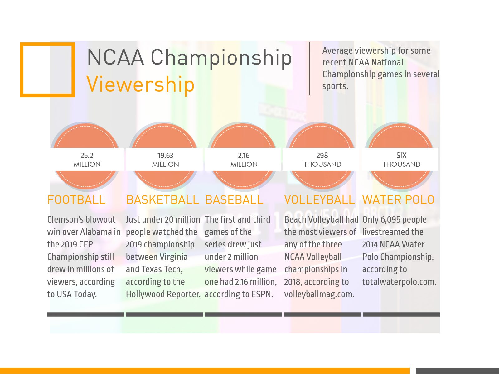 Viewership statistics for some notable NCAA Championship events, according to USA Today, the Hollywood Reporter, ESPN, totalwaterpolo.com, and volleyballmag.com. Infographic by Kyle McCabe.