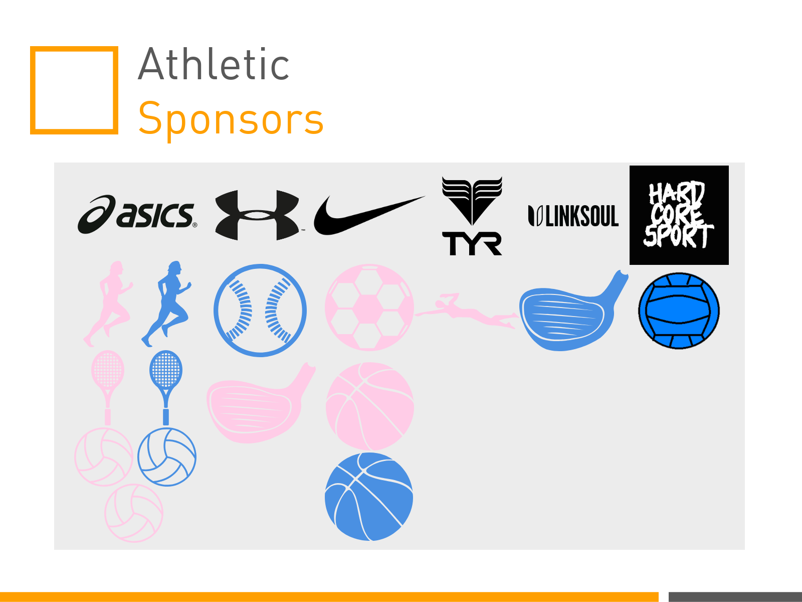This infographic shows all of the athletic apparel sponsors Pepperdine partners with and their coordinating sports. Pink graphics represent women’s sports, and blue graphics represent men’s sports. Infographic by Kyle McCabe.