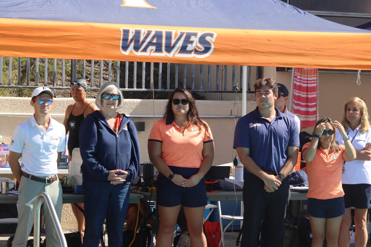 Head Coach Dan Marella (third from right) stands next to former head coach Ellie Monobe (third from left) at Raleigh Runnels Memorial Pool on Oct. 4 at the Rodionoff Invite. Marella is taking over the program after Monobe left midseason. Photo by Katherine Lytle