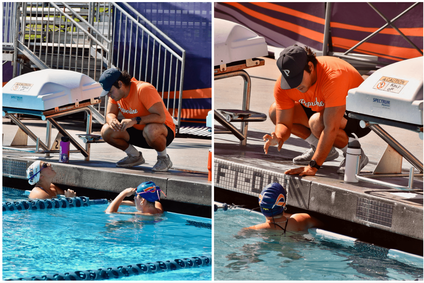 Dan Marella, Swim/Dive head coach, leans down at Raleigh Runnels Memorial Pool on Oct. 2, 2024 to talk to his swimmers during the Rodionoff Invite. Marella has been with the program since September 2022, according to Pepperdine Athletics. File photos by Mary Elisabeth (’25)