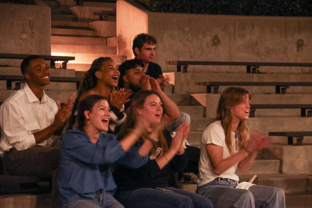 Audience members clap and cheer during Drelli’s set at KWVS Live on Sept. 18 in the Amphitheatre. Drelli passed out “Pepperdine Loves Drelli” shirts to audience members.