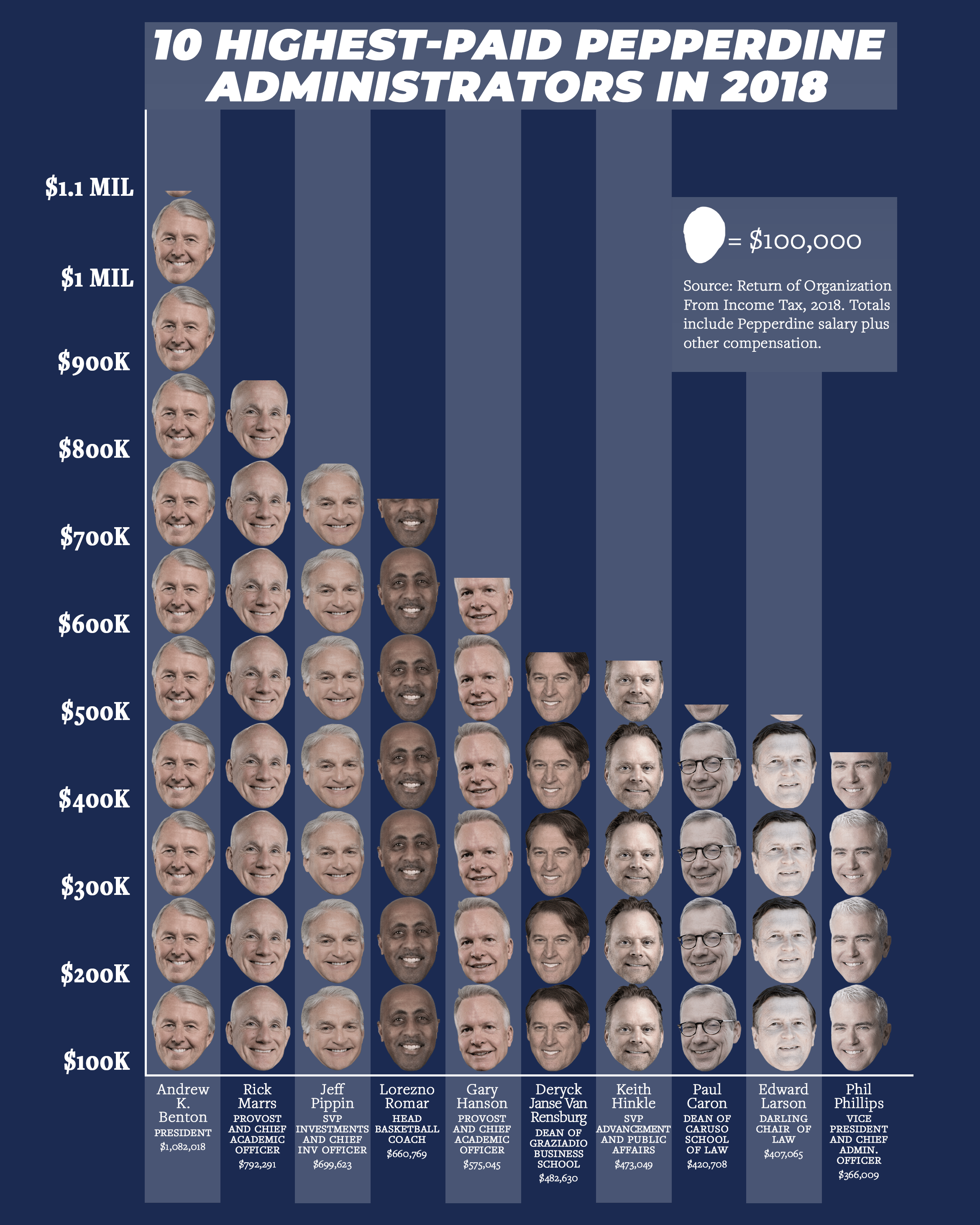 Pepp’s 2019 Tax Information Reveals Top-Ten Highest-Paid Administrators November 18, 2020 by Ashley Mowreader Infographic by Ali Levens Ashley Mowreader/Ali Levens ____________________ Follow the Graphic on Twitter: @PeppGraphic Email Ashley Mowreader: ashley.mowreader@pepperdine.edu
