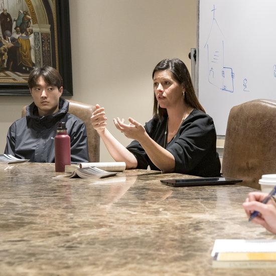 Hooten Wilson teaches in the Great Books classroom in Payson Library. She said she hopes her teaching impacts how her students live their lives. Photo courtesy of Pepperdine Seaver College