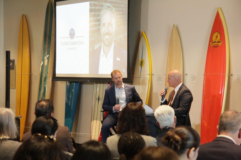 Gash connected those themes to Pepperdine’s mission as a Christian university. He asked Tate how he understands his own greater purpose and what faithfulness looks like in his professional life.