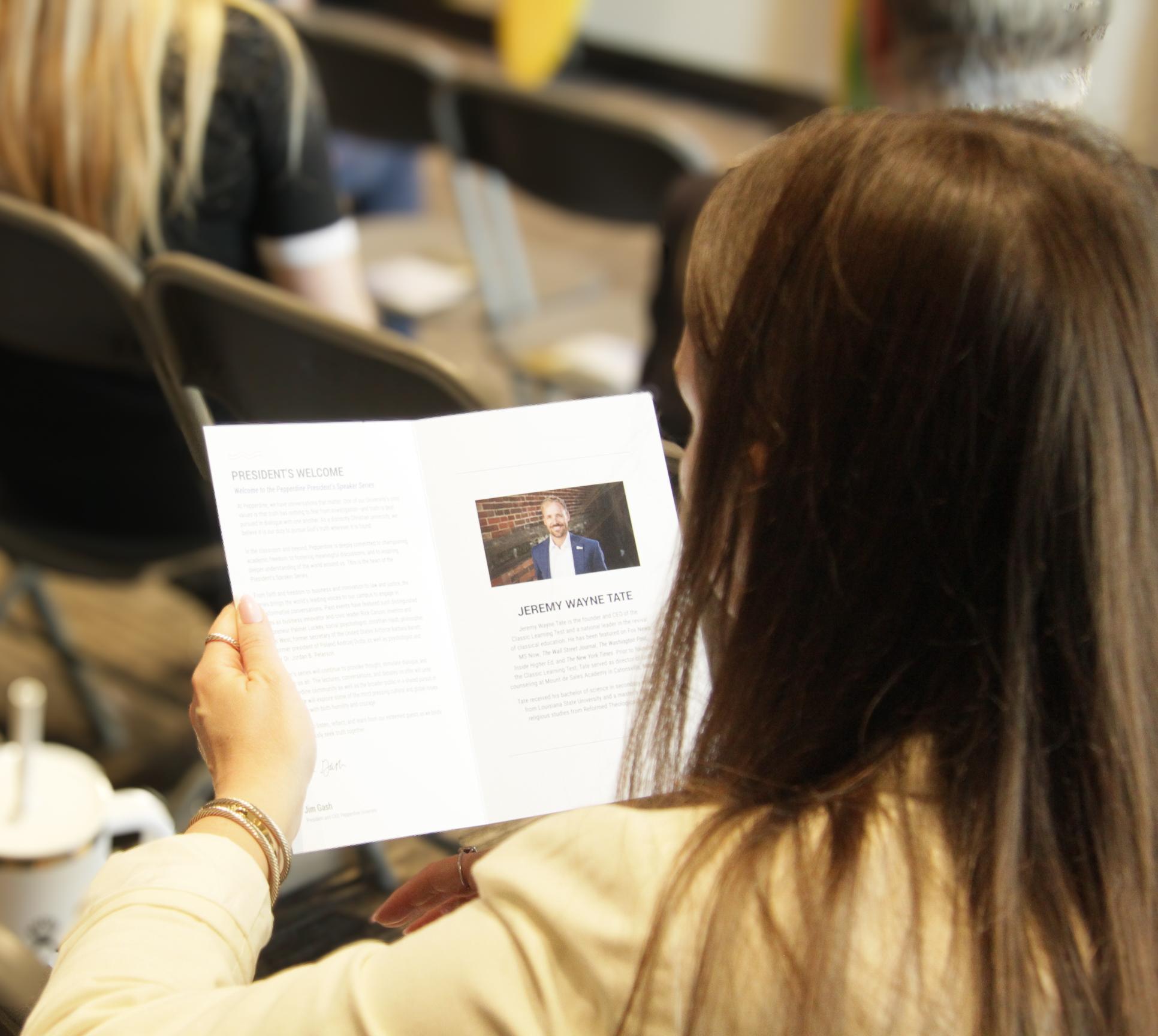 A student reads a pamphlet detailing Tate’s career path at the President’s Speaker Series on Feb. 26. The event lasted about an hour.