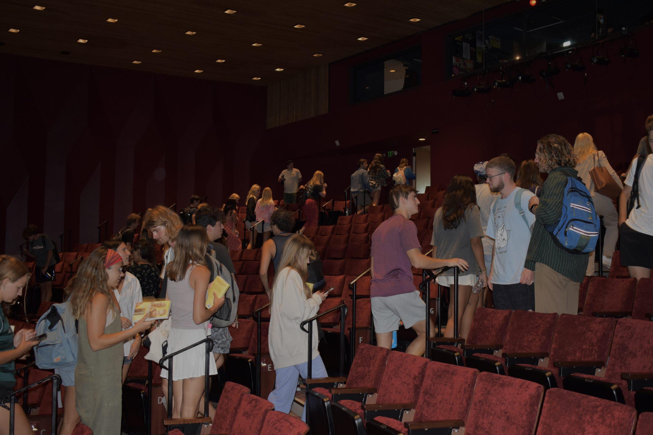 Seaver students are shown exiting the theater with copies of the book "Divine Collision" at the end of the screening on Aug 30. Gash and Tumusiime wrote a book about their experiences and journey together. Photo by Mary Elisabeth