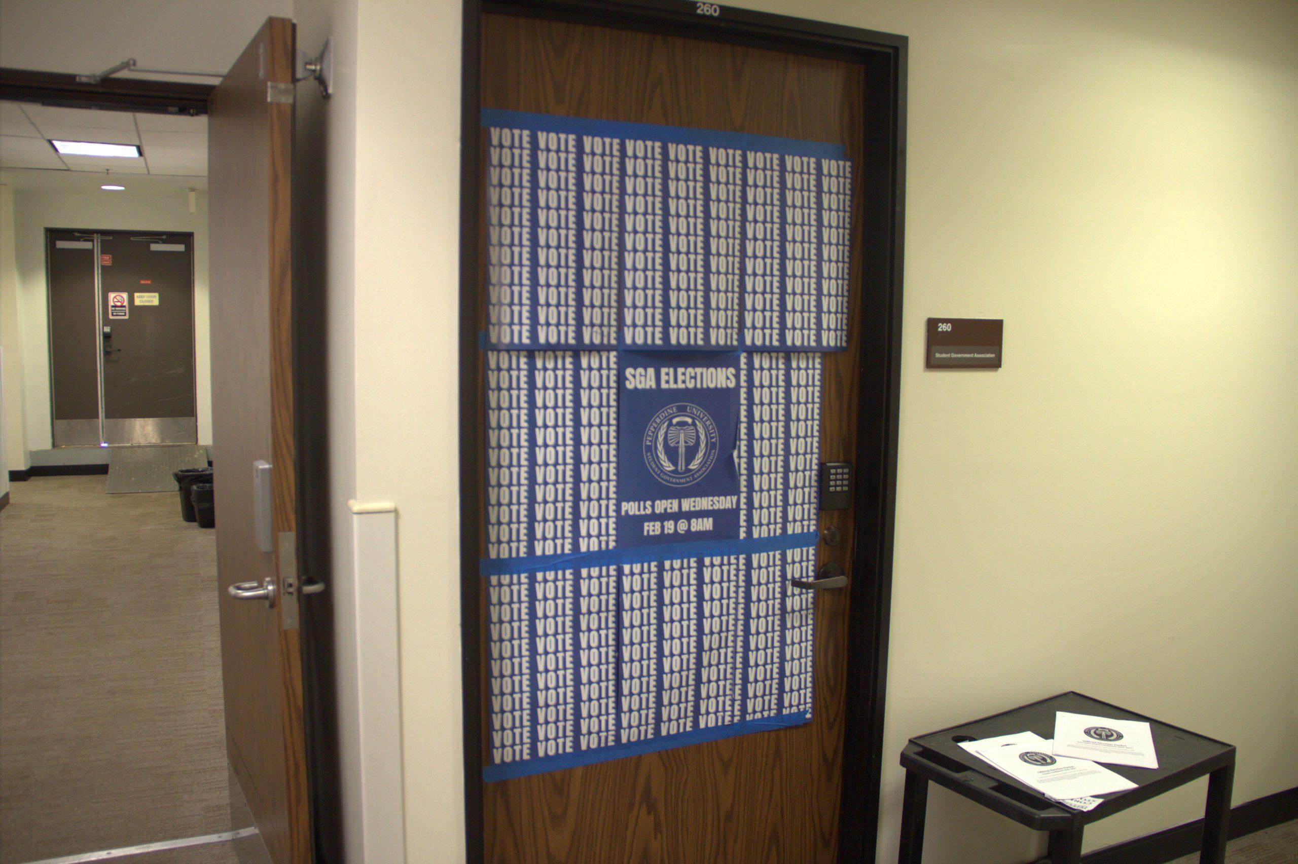 Election flyers cover the door to the Student Government Association (SGA) office at Tyler Campus Center on March 8. Executive Vice President-Elect Jandy Nguyen said she wanted to make SGA’s pre-existing office hours more public. Photo by Oliver Evans