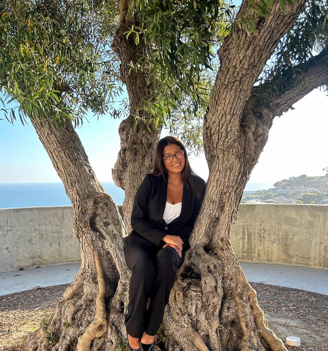 President-elect Emily Espinosa sits in the tree on Scaife Terrace in April 2025. Espinosa said the tree is her favorite place on campus. Photo courtesy of Emily Espinosa