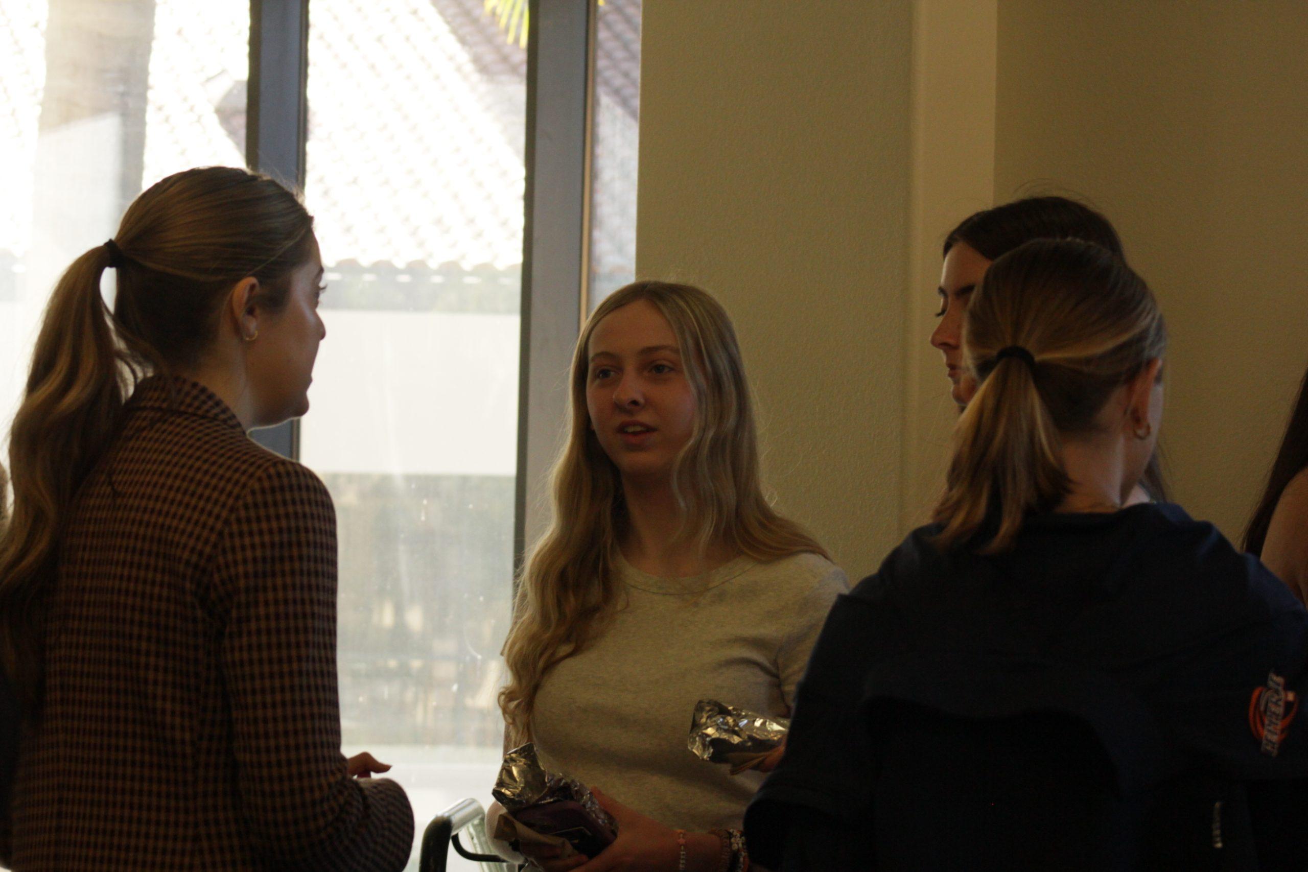 McCullough, Vice President Jacqueline Justiss, Senior Class President Julian Moghaddasi and Senior Class Senator Gavin Legos have a conversation in the HAWC on Feb. 4. Moghaddasi said he felt competition between the classes kept everyone’s work good, including the hoodies.