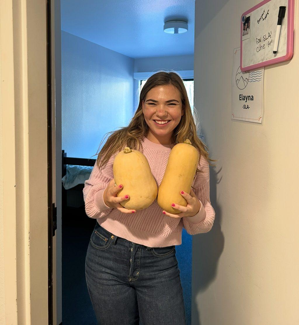 Junior Elayna McClure poses in her dorm in Rockwell Towers with the butternut squash she bought from Trader Joe’s on Oct. 19. She said decorating her dorm makes her feel grounded in the fall season. Photo courtesy of Elayna McClure