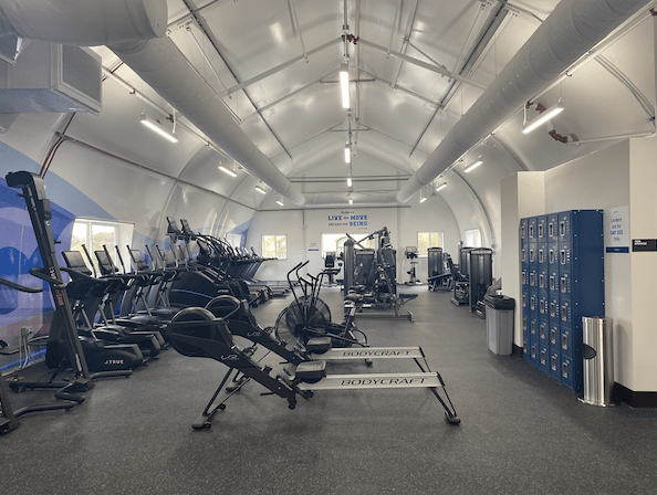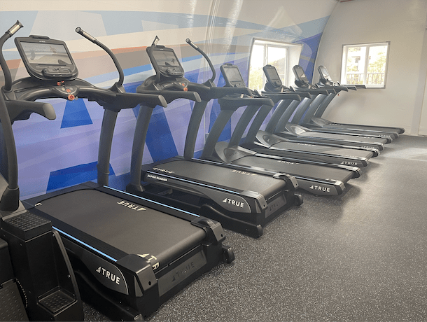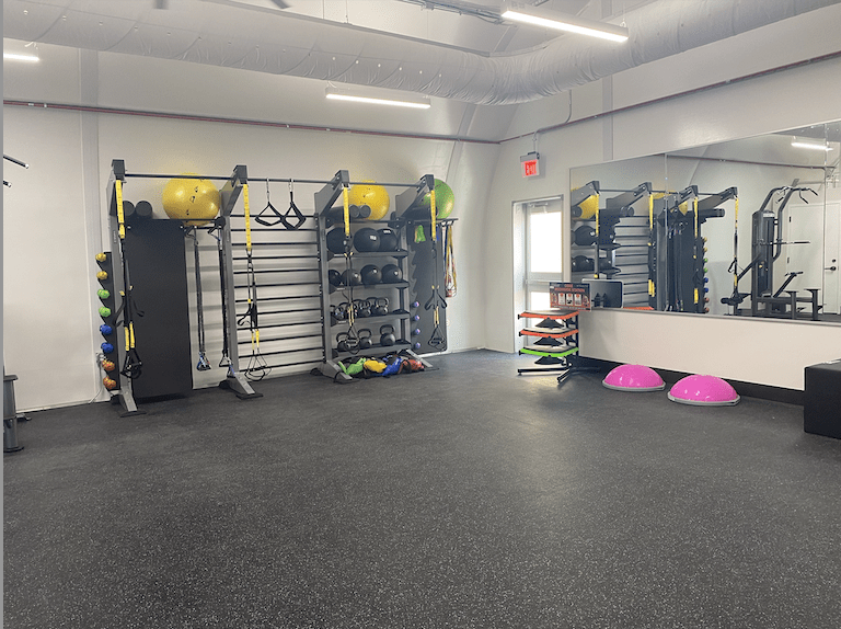 The center is split into two main wings — one with cardio and space for app workouts and stretching, and the other dedicated to more advanced weightlifting workouts.