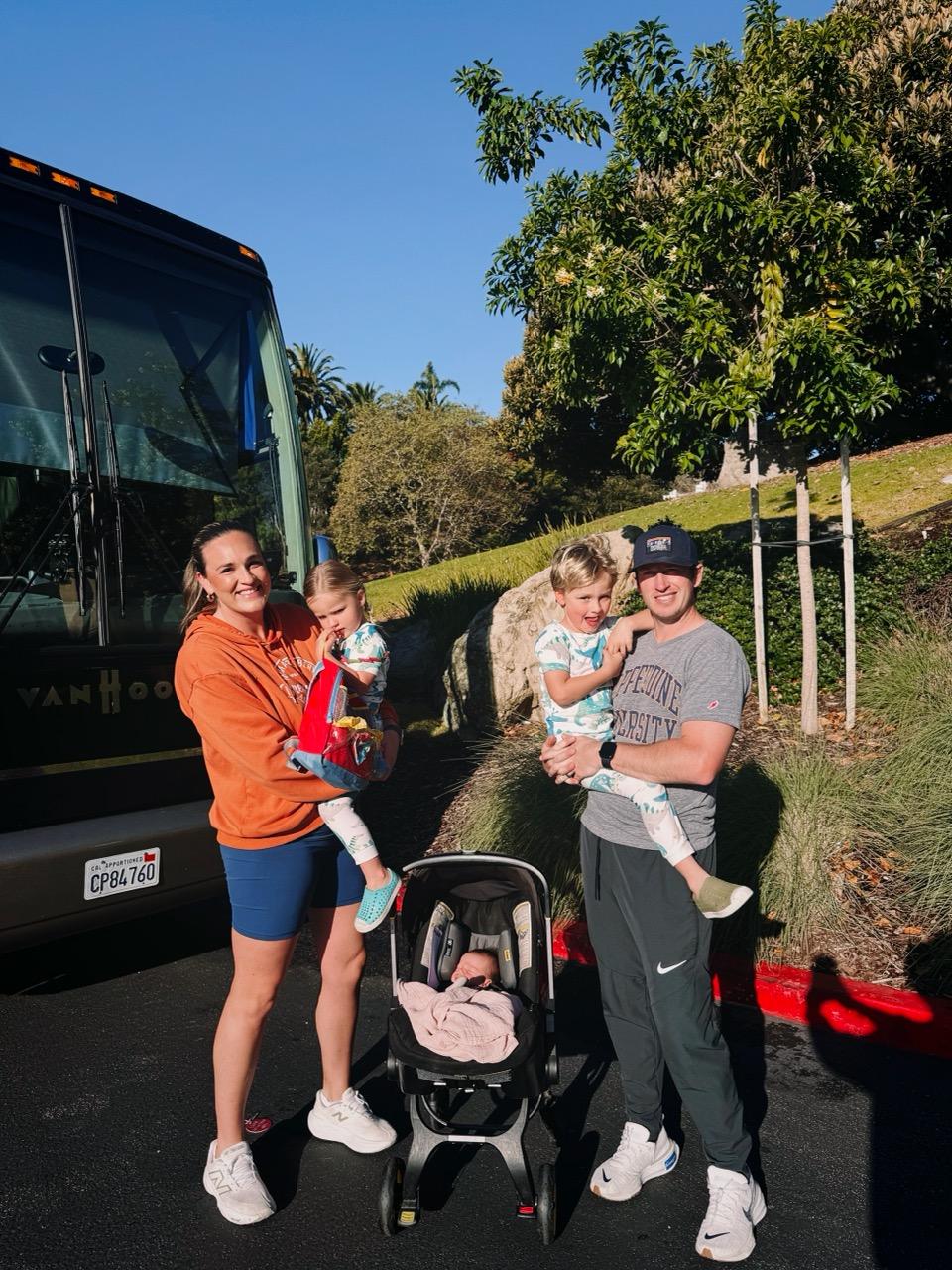(From left to right) Katie, Laney, Cali, Baker and Derek Faulkner pose outside of a team bus as a family of five. Cali was the first baby born midseason, bringing new challenges to the athletics-centered family.