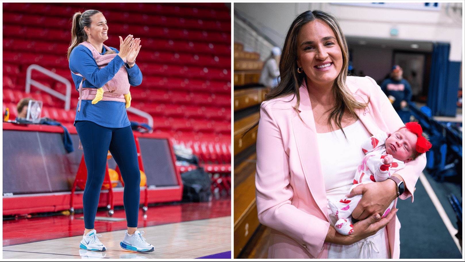 Women’s Basketball Head Coach Katie Faulkner holds her newborn baby while coaching through the 2025-26 season. Faulkner gave birth to her third child, Cali Jo, in February and returned to the court just 10 days later. Photos courtesy of Pepperdine Athletics