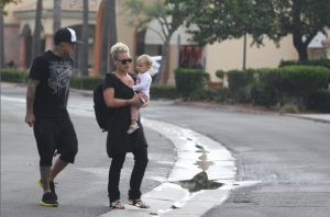 Pink, husband Cary Hart, and daughter Willow smile their way to the Starbucks by Ralphs on October 8, 2012.