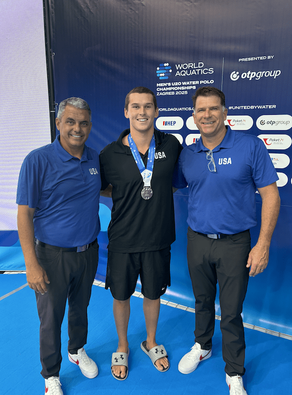 Junior utility player Jon Carcarey (middle) with Pepperdine alumni Alex Rodriguez (98) (left) and Jack Kocur (98) (right). This photo was taken after Carcarey had helped the Junior National Team take silver in the U20 World Championships in June in Croatia.