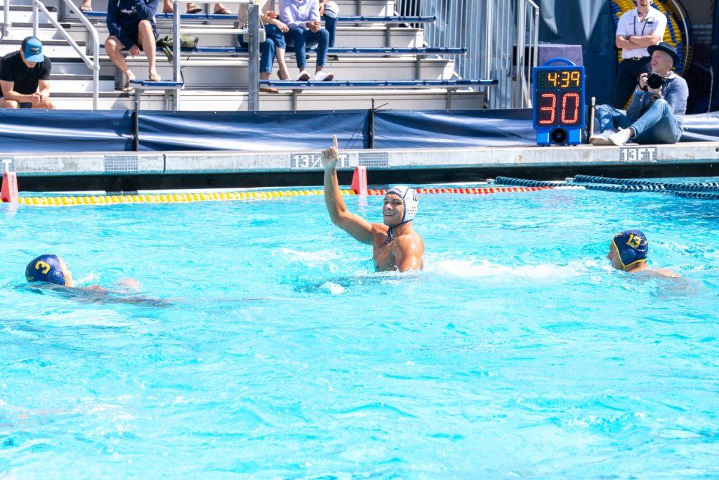 Freshman utility Csanád Bella celebrates a point against the University of California, Berkeley on Sept. 27 at the Spieker Aquatics Complex. Bella has appeared in all 24 matches on the season, scoring 19 goals.