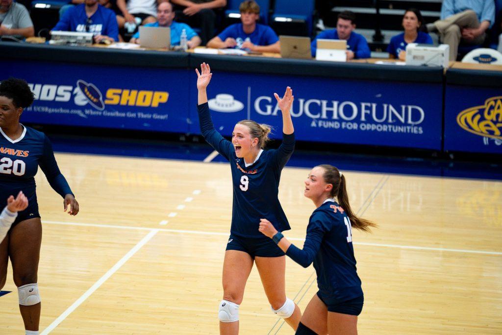 Freshman setter Tristen Raymond celebrates a point against the University of California, Santa Barbara on Sept. 16 at the Thunderdome. Raymond has tallied 522 assists in 82 sets on the season, leading the Waves in that statistical category. Photos courtesy of Pepperdine Athletics